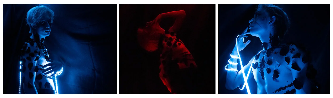 Everyone knows you cannot go through life unscathed. Whether it is physical or emotional, as easily forgotten as a cut or as bitter as heartbreak, everyone at one point or another has become accustomed to pain. “Maturation” is a photographic series depicting an individual who has endured pain, decorated in dead rose petals and bathing in blue and red lights. In “Maturation,” I explore the response to a painful experience, showing not only how pain can be transformed into beauty, but also how the way we recover from pain is beautiful in itself. With this piece I hope to move people to embrace their pain, and to take a step to overcome it. I chose to represent pain through dead rose petals, as the living rose is a symbol of life, vibrancy, and love. But in “Maturation,” the subject embraces the dead rose petals as a part of himself and manages to see the beauty through the pain: for healing can only be achieved through an integration of all of our experiences, including the painful ones.